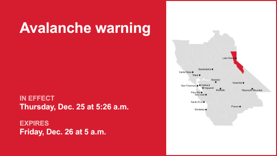 A las 5:26 a. m. del jueves, el Servicio Meteorológico Nacional emitió una advertencia de avalancha que estuvo vigente hasta las 5 a. m. del viernes 26 de diciembre para el área metropolitana de Lake Tahoe.