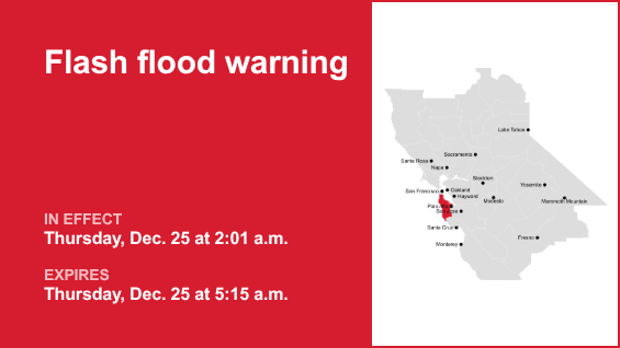 Los condados de San Mateo y Santa Clara fueron puestos bajo una advertencia actualizada de inundación repentina por parte del Servicio Meteorológico Nacional a las 3:11 a.m. del jueves. La advertencia está vigente hasta las 6:15 a.m.