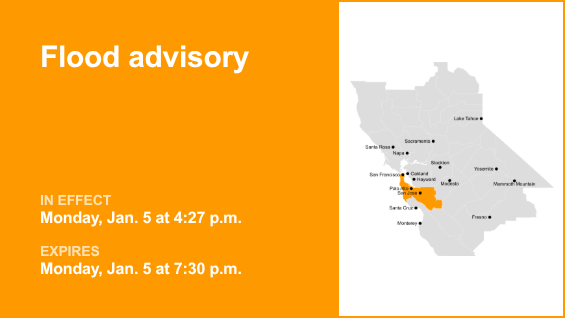 El Servicio Meteorológico Nacional emitió una advertencia de inundación para los condados de San Francisco, San Mateo y Santa Clara a las 4:27 p.m. Lunes. La advertencia está vigente hasta las 19:30 horas.