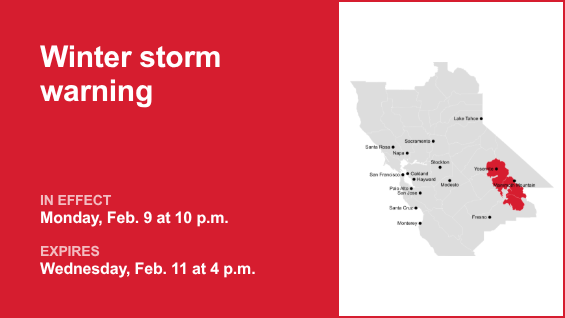 Yosemite, el río Upper San Joaquín y desde Kaiser hasta Rodgers Ridge son el foco de una advertencia de tormenta invernal emitida por el Servicio Meteorológico Nacional a las 12:19 p.m. Lunes. La advertencia está vigente desde las 22:00 horas. hasta las 4 p.m. el miércoles 11 de febrero