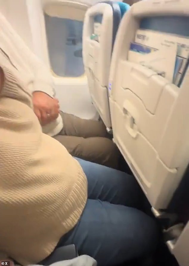En varias ocasiones se vio al padre acomodándose para sentirse cómodo en los estrechos asientos, pero no parecía haber espacio visible entre sus piernas y el asiento frente a él.