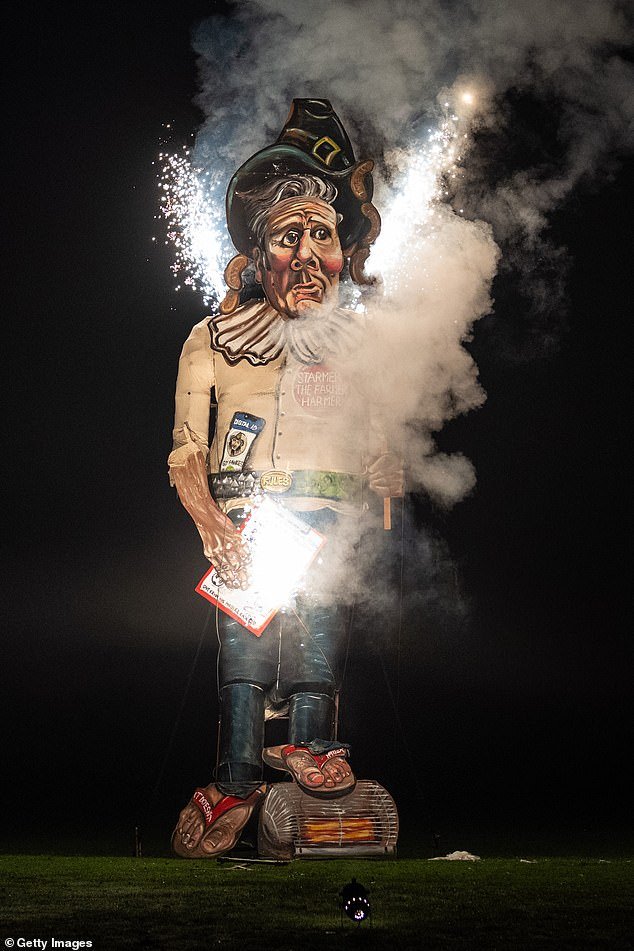 A principios de esta semana, efigies gigantes de Sir Keir fueron arrastradas por las calles mientras el asediado Primer Ministro era objeto de burlas durante las celebraciones de la Noche de las Hogueras en Lewes, East Sussex.