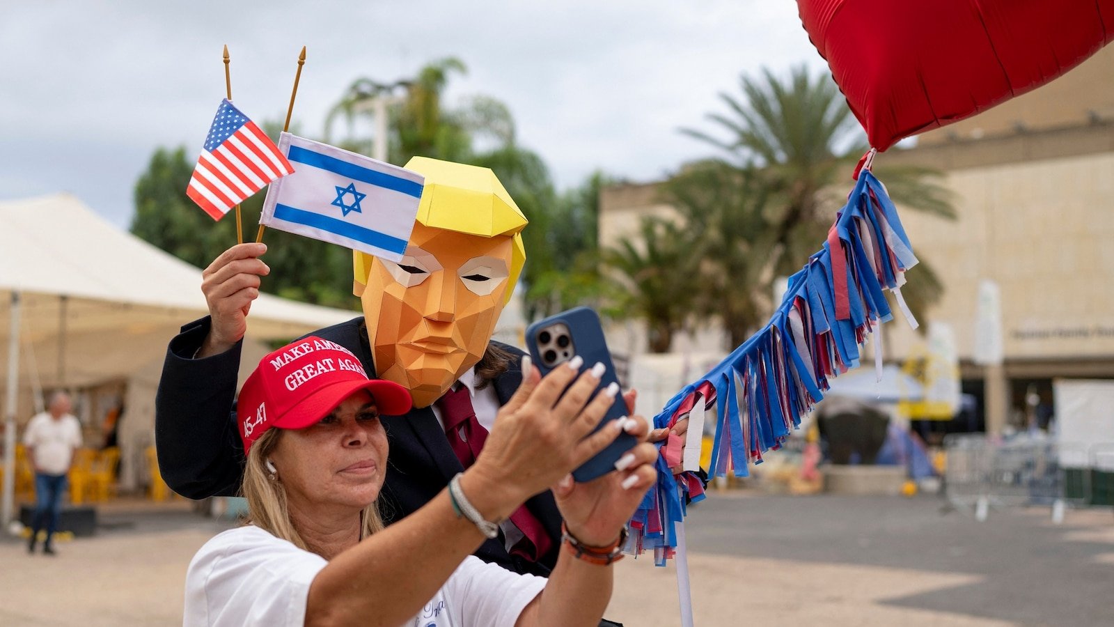 Una persona que lleva una máscara que representa al presidente estadounidense Donald Trump sostiene banderas estadounidenses e israelíes en la Plaza de los Rehenes en Tel Aviv el 9 de octubre de 2025.