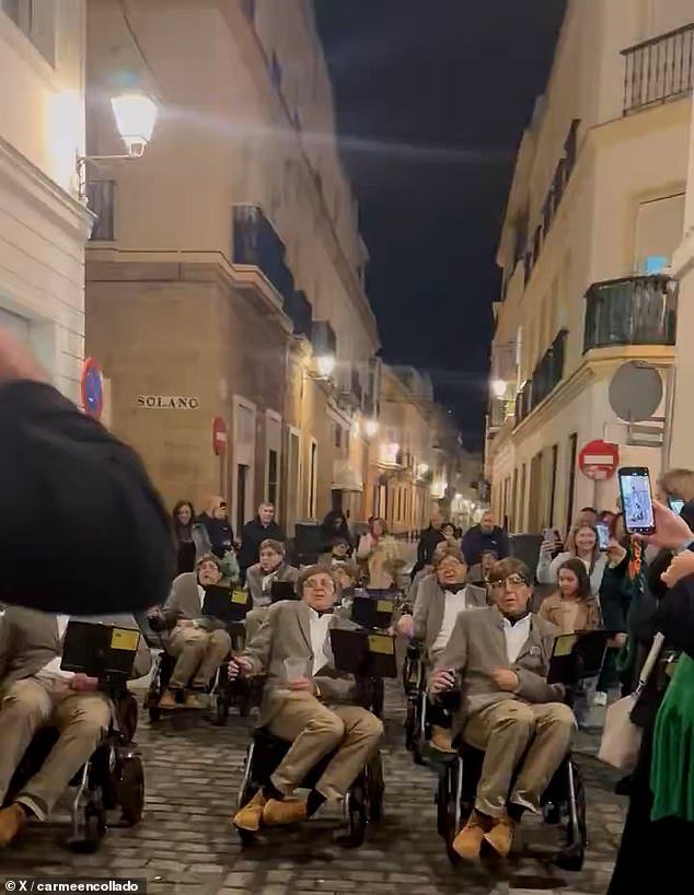 Un grupo de 12 hombres en sillas de ruedas fueron vistos caminando por las calles adoquinadas de Cádiz cantando “Qué bonita, qué bonita es Cádiz” mientras los espectadores filmaban la procesión esta semana.