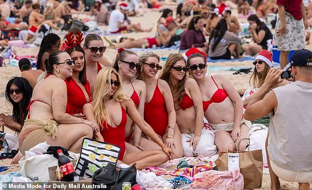 Decenas de australianos acudieron a la playa el jueves para las celebraciones navideñas