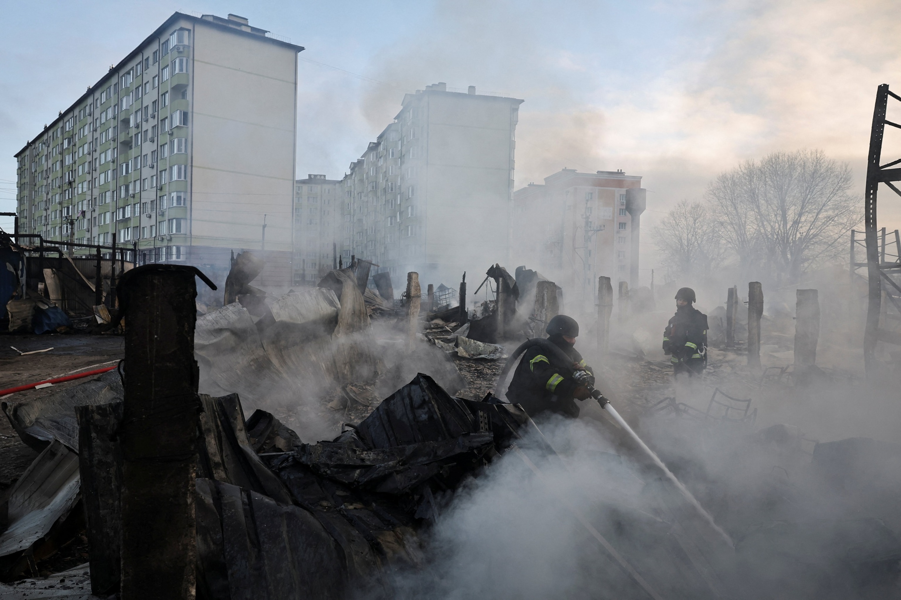 Los trabajadores de rescate trabajan en el lugar de un almacén que fue alcanzado durante una noche de ataques con misiles y drones rusos en Novi Petrivtsi, en las afueras de Kiev, Ucrania, el 6 de diciembre de 2025.