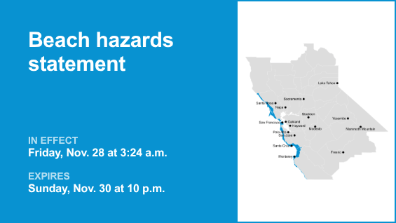 La costa norte de la Bahía, incluida la costa nacional de Point Reyes, la costa de la península de San Francisco, el norte de la bahía de Monterey y el sur de la bahía de Monterey y la costa de Big Sur, así como el condado de San Francisco, están incluidas en una declaración de peligro de playa emitida por el Servicio Meteorológico Nacional a las 3:24 a.m. del viernes. La declaración es válida hasta el domingo 30 de noviembre a las 22 horas.