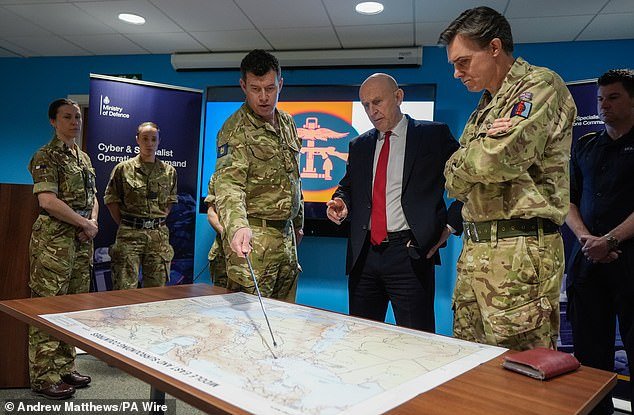 El Secretario de Defensa, John Healey, recibe hoy una sesión informativa mientras se reúne con personal militar durante una visita al Cuartel General Conjunto Permanente en RAF Northwood, en Hertfordshire.
