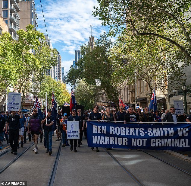 Después de unas pocas palabras pidiendo la liberación de Roberts-Smith e instando a las personas que nunca fueron a la guerra a mantener la calma, la marcha comenzó con explosiones de AC/DC en todo el CBD de Melbourne.