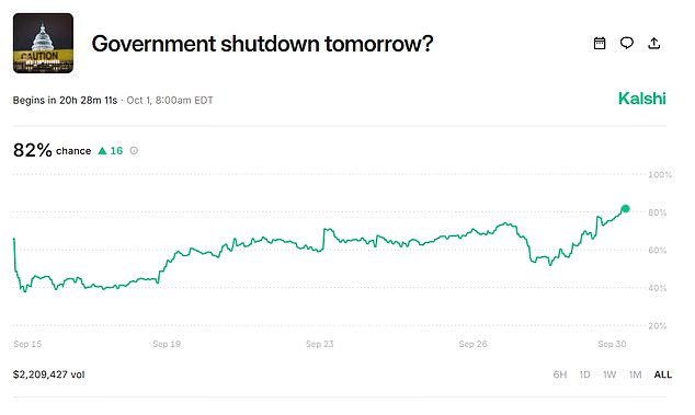 La probabilidad de cerrar el mercado predictivo Kalshi aumentó al 87.3 por ciento esta mañana y luego al 84 por ciento. Esto significa cada una apuesta de 100 dólares en un cierre estatal, los jugadores ganan 20 dólares estadounidenses, apuestas contra $ 489