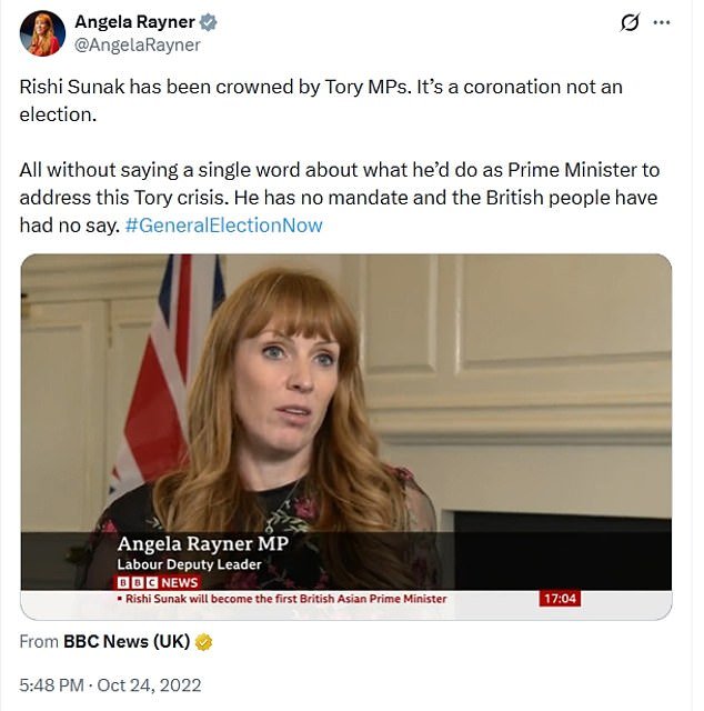 Afirmó en ese momento que Sunak “no tenía mandato y el pueblo británico no tiene voz y voto”, al tiempo que criticaba una “coronación” del nuevo primer ministro.