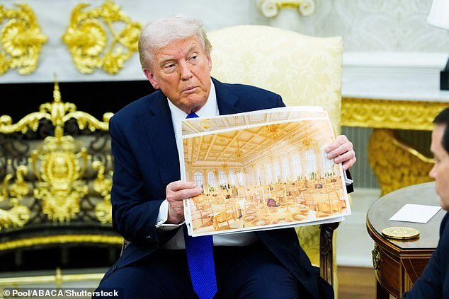 El presidente mostró fotografías del ornamentado salón de baile durante la reunión, y sobre la mesa había un modelo de cómo lucirá el complejo una vez que se complete la nueva ala.