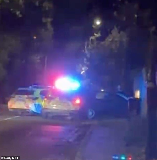 El vídeo tomado por un vecino cercano mostró el coche abandonado del sospechoso estacionado en ángulo recto en la entrada de una propiedad, rodeado de coches de policía con luces azules intermitentes.