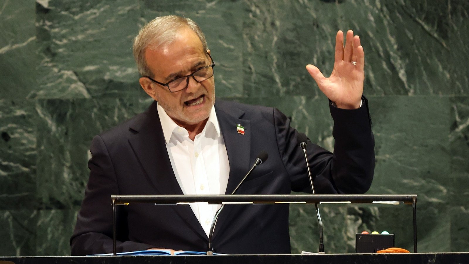El presidente de Irán Masoud Pezeshkian apela a la Asamblea General de las Naciones Unidas durante la 80ª reunión del evento anual el 24 de septiembre de 2025 en la ciudad de Nueva York.