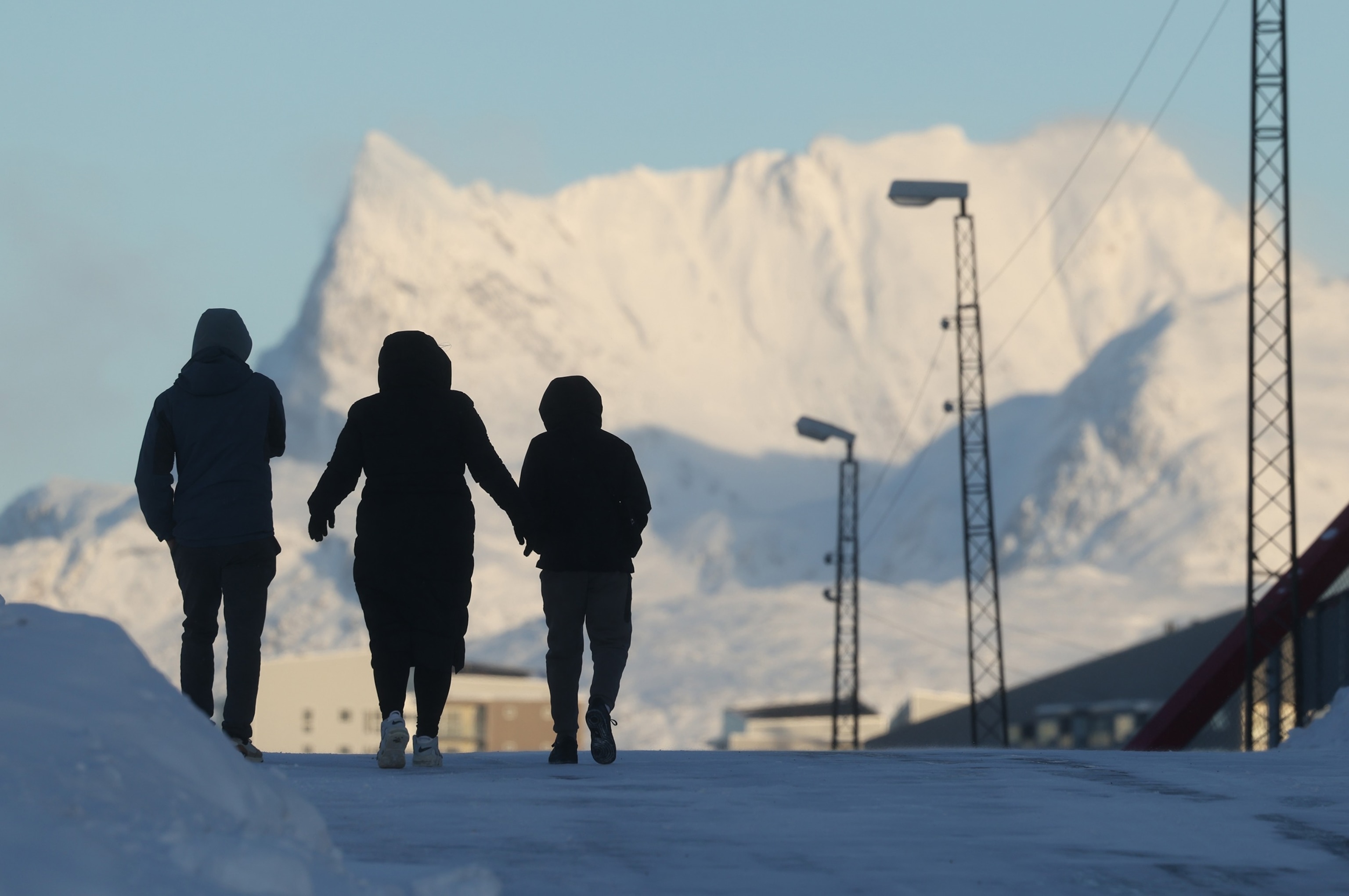 La gente camina por una calle cubierta de nieve mientras el monte Sermitsiaq se asoma detrás, el 20 de enero de 2026 en Nuuk, Groenlandia.