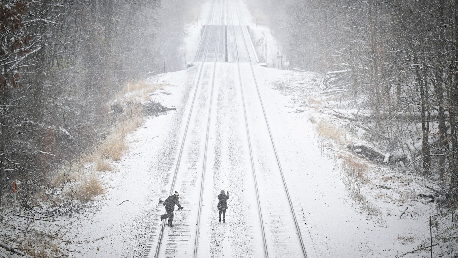 La gente explora la primera nieve de la temporada a lo largo de las vías del ferrocarril cerca del lago Accotink, el 5 de diciembre de 2025 en Springfield, VA.