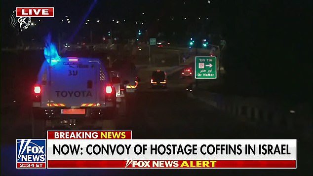 Un convoy que transportaba a cuatro rehenes israelíes en ataúdes cruzó la frontera de Gaza de regreso a su tierra natal.