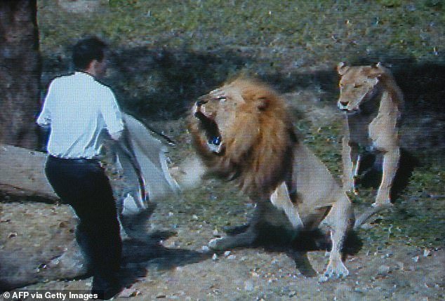 Luego se quitó la chaqueta y la agitó. Con un rugido, uno de los animales enojados, un macho con una enorme melena, se abalanzó sobre él y se lo quitó de la mano.