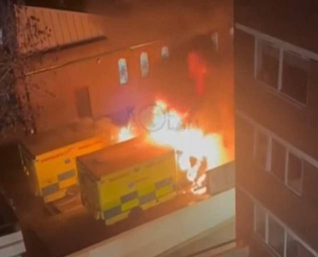 Imágenes de CCTV mostraron a tres figuras encapuchadas (en la foto) que parecían verter acelerador sobre los vehículos antes de prenderles fuego.