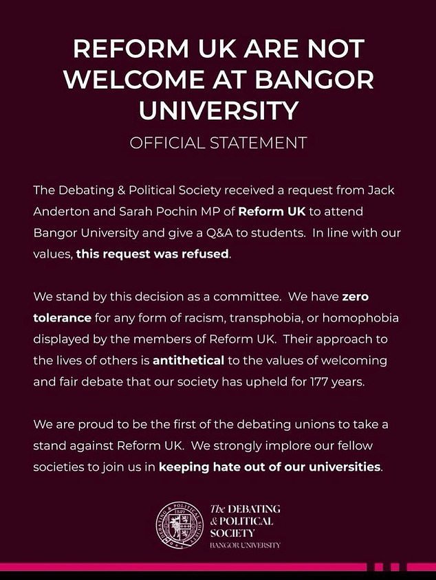 La señora Pochin, que fue prohibida junto con su asesor de partido, Jack Anderton, añadió: “Hasta aquí la libertad de expresión en nuestras universidades”. ¿Cómo puede el Club de Debate de la Universidad de Bangor tener miedo al debate?