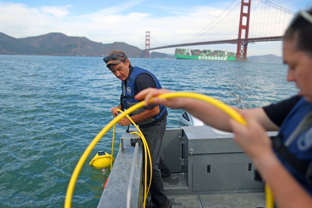 La niebla se cierne sobre el Golden Gate, oscureciendo las bocinas a todo volumen de los buques de carga que intentan advertir a otros barcos de su presencia. A bordo de un pequeño barco de investigación cercano, se sumergen micrófonos submarinos llamados hidrófonos, junto con otros sensores, bajo la superficie para capturar el coro oculto de la Bahía de San Francisco: las ballenas.