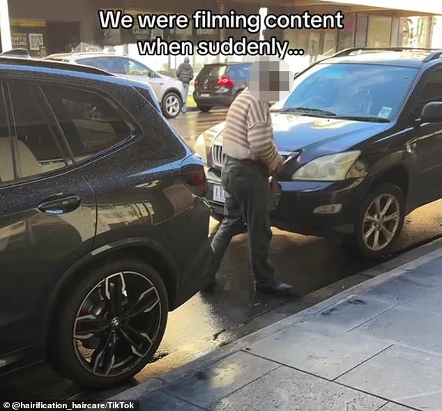 El fundador de Hairification, Jordan Mylius, estaba filmando un video para su marca en Chapel Street en Melbourne cuando un hombre (en la foto) se agachó detrás de su auto para hacer caca.