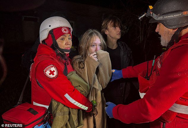 Un padre abraza a su hijo mientras reacciona después de que su madre muriera durante un ataque con aviones no tripulados rusos durante el ataque de Rusia a Ucrania, el 23 de noviembre de 2025, en Kharkiv, Ucrania.