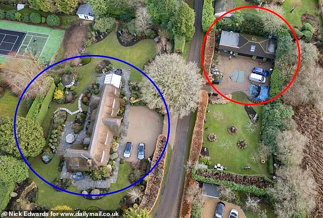 Lord Philip Harris, el magnate de los suelos conocido como el ‘Rey de las alfombras’, siguió adelante con la construcción del enorme garaje (derecha) a pocos metros de su casa (izquierda) en Holmbury St Mary, Surrey, a pesar de que sus planes originales fueron rechazados.