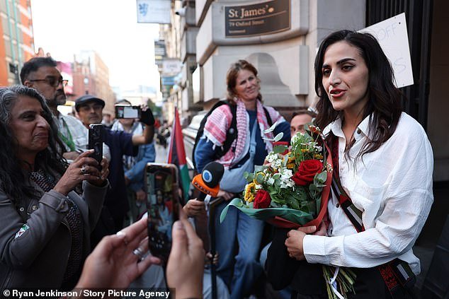 Ella habló a través de las lágrimas y le dijo a la audiencia que más de 50 de sus amigos habían muerto durante el conflicto en Gaza, al que se refería como “genocidio” y “Holocausto”.