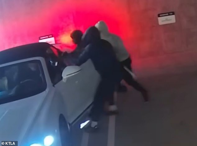 El ataque, captado por las cámaras de vigilancia, muestra a tres hombres enmascarados bloqueando el inmaculado Bentley blanco de la víctima y arrastrándolo al suelo.