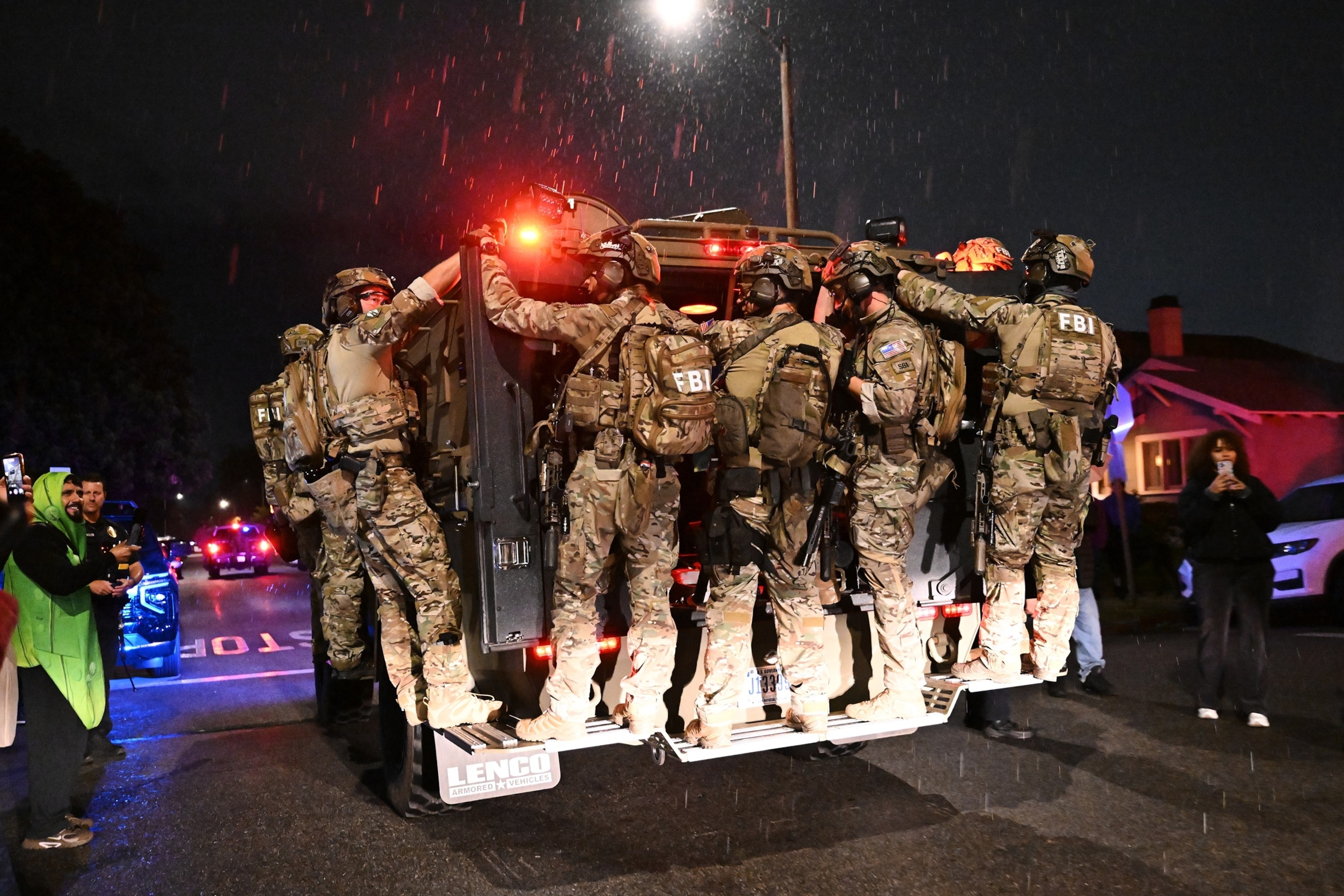 Los agentes del FBI abandonan la escena después de responder a un discurso relacionado con Cole Tomas Allen, el sospechoso del tiroteo, en la cena de corresponsales de la Casa Blanca el 26 de abril de 2026 en Torrance, California.