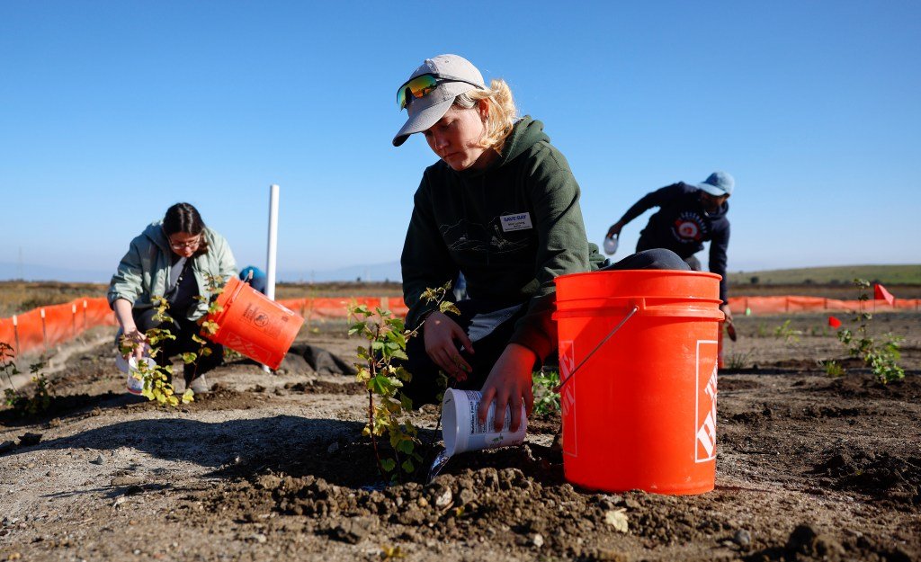 Los voluntarios se encontraban en la costa de Harbor Marsh en Palo Alto Baylands el miércoles por la mañana temprano, participando en los esfuerzos para construir una zona de amortiguación natural para absorber las marejadas ciclónicas y mitigar las inundaciones en medio del cambio climático y el aumento del nivel del mar que amenazan a las comunidades costeras.