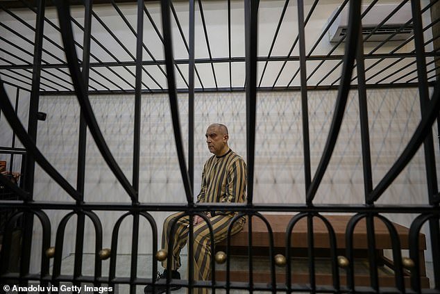 Atef Najib, primo del líder depuesto, parecía impasible mientras lo hacían desfilar en una jaula vistiendo un uniforme de prisión a rayas mientras era juzgado por cargos de tiroteos masivos y tortura de niños.