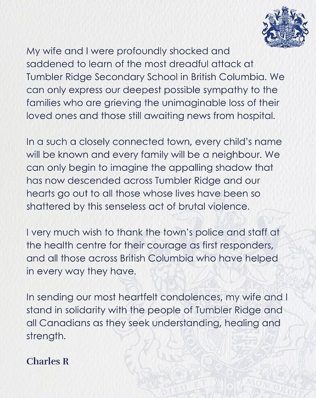 El Rey ha expresado su profunda “conmoción y tristeza” por el “acto sin sentido de violencia brutal” en la escuela secundaria Tumbler Ridge, uno de los tiroteos masivos más mortíferos en la historia de Canadá.