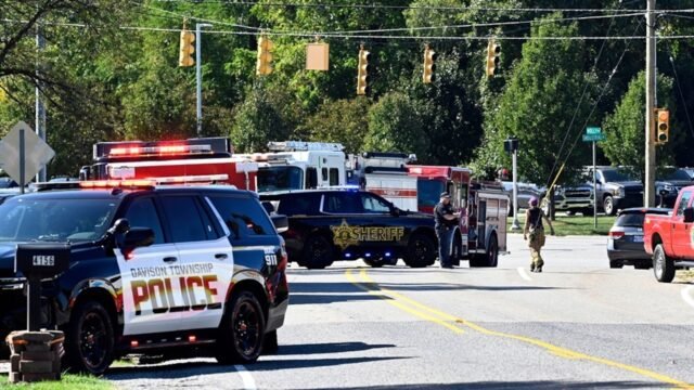 El personal de la policía y la brigada de bomberos están cerca de la esquina de McCandlish y Holly Road, cerca de un tiroteo que tuvo lugar el domingo 28 de septiembre de 2025, en Grand Blanc, yo, en la iglesia de Jesucristo de los santos de los últimos días.