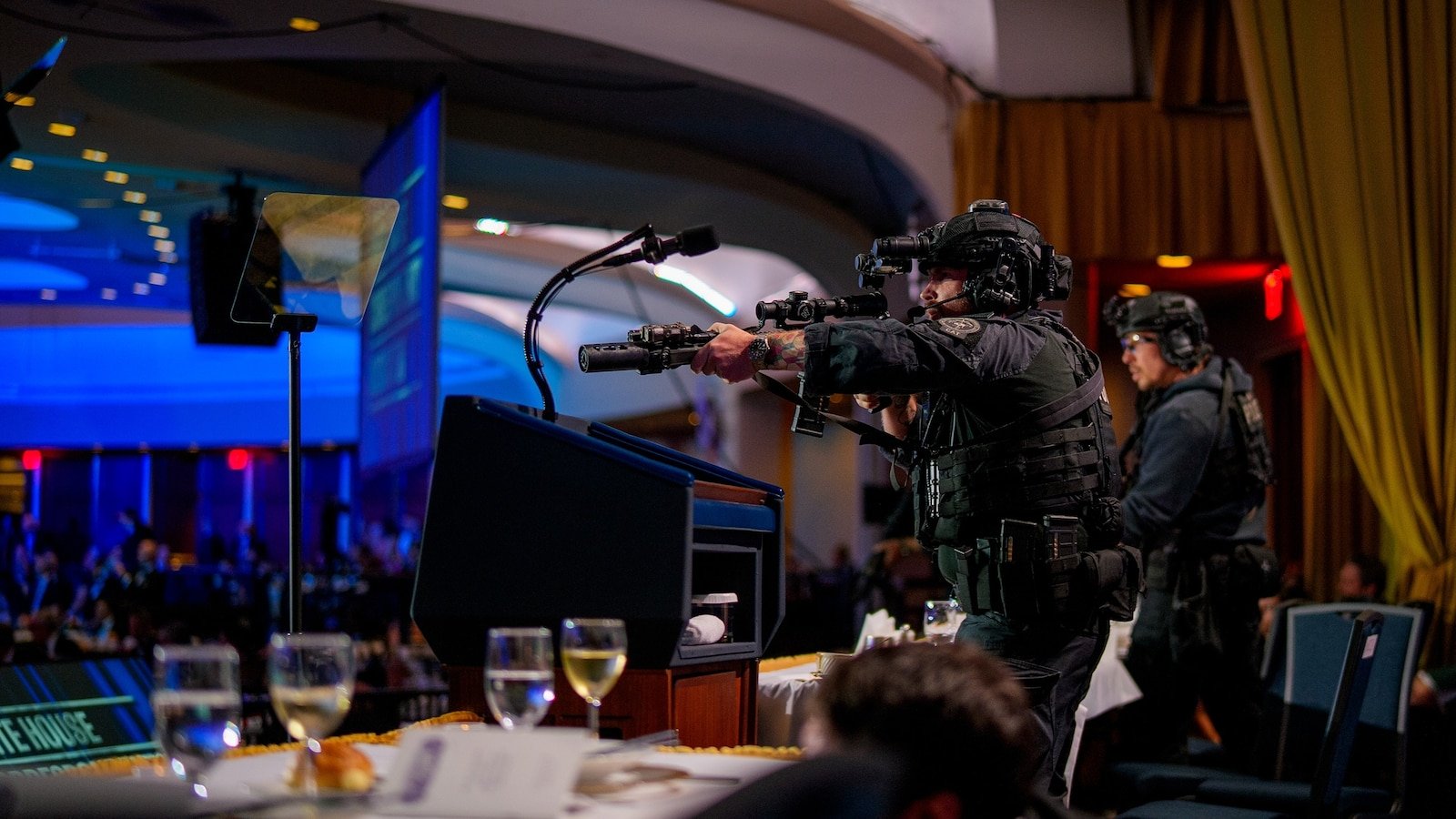 Agentes armados del Servicio Secreto están en el escenario durante un tiroteo en la cena anual de la Asociación de Corresponsales de la Casa Blanca en el Washington Hilton el 25 de abril de 2026 en Washington.