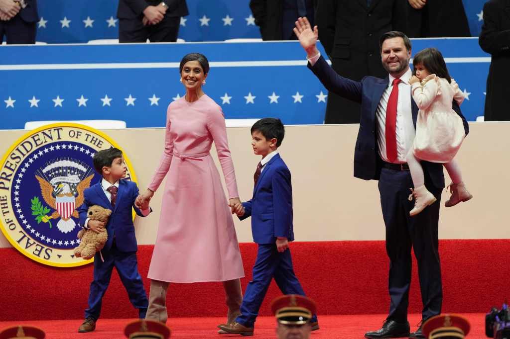 La vicepresidenta estuvo acompañada en sus viajes al extranjero por Usha Vance y sus hijos. Los niños suelen usar pijamas cuando abordan el Air Force Two para viajes nocturnos.