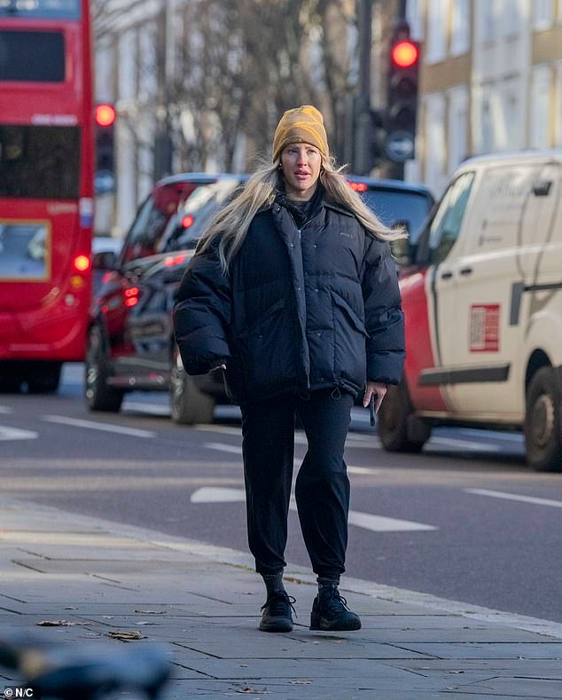 Ellie Goulding, de 38 años, fue vista paseando por las calles del oeste de Londres la semana pasada con una chaqueta acolchada de Miu Miu valorada en £ 2,950 que ocultaba su figura generalmente delgada.