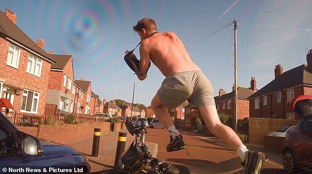 Una raqueta con un torso desnudo amenazó el “karma inmediato” después de haber huido de la policía con una bicicleta electrónica robada.