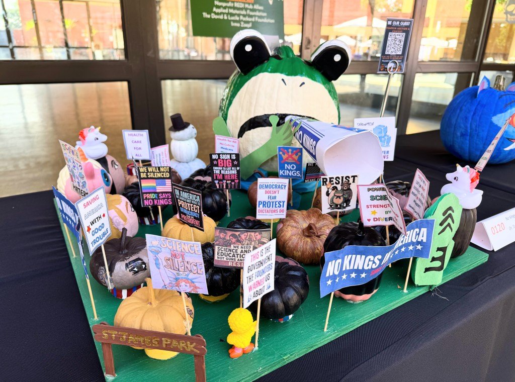 Había calabazas que hacían referencia a las protestas “No Kings” e instaban a los votantes a aprobar la Medida A del condado de Santa Clara. Tres calabazas hacían referencia al éxito de la cultura pop “K-Pop Demon Hunters” y una, creada por la empleada de Silicon Valley Community Foundation, Daniela Ruvalcaba, era una celebración exagerada de la próxima actuación de Bad Bunny en el Levi’s Stadium durante el Super Bowl LX. Había dos calabazas decoradas como mascotas Golden State Valkyries y una calabaza Labubu (porque es el año 2025 y tener tener una calabaza Labubu).