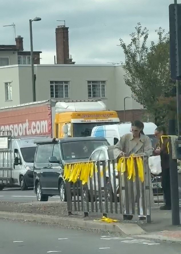 Otras dos mujeres fueron filmadas mientras demolían cintas amarillas para rehenes judíos, solo un día después de que un artista judío palestino las había eliminado de la barandilla en Londres.