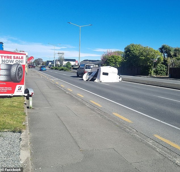 En la imagen se puede ver la caravana avanzando por Blenheim Road en Riccarton. La policía confirmó que el conductor recibió una notificación de delito menor después de la terrible experiencia.