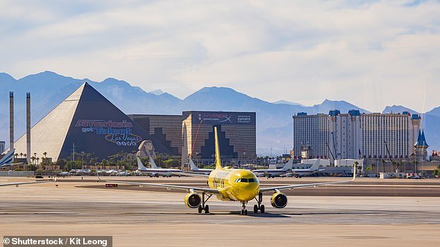 Las Vegas se enfrenta a otra gran caída en el turismo, mientras que los estadounidenses evitan volar temores de que el cierre del gobierno cause caos y demoras en los aeropuertos (fatefoto de un avión Spirit Airlines en Harry Reid y Las Vegas Strip)