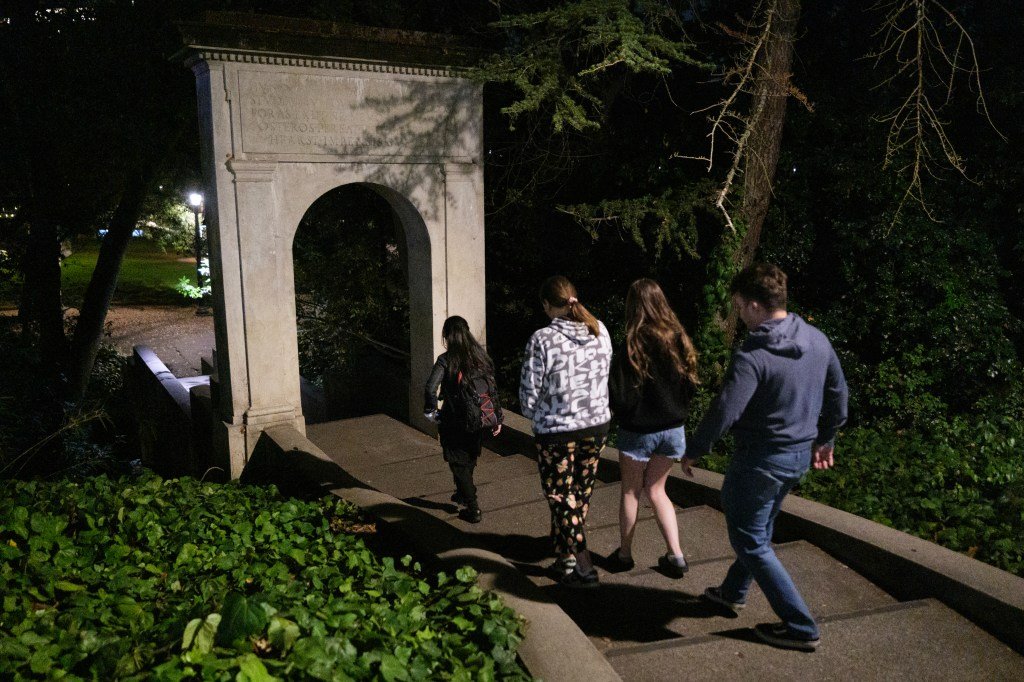 Esta noche realizaremos una caminata de 1,7 millas alrededor del campus y el vecindario circundante, hogar de algunos de los edificios más antiguos de la ciudad. El viaje comienza con la piel de gallina, pero a mitad de camino da un giro aterrador, advierte Liu. Firmamos un descargo legal liberando de responsabilidad por sufrir un infarto por miedo.