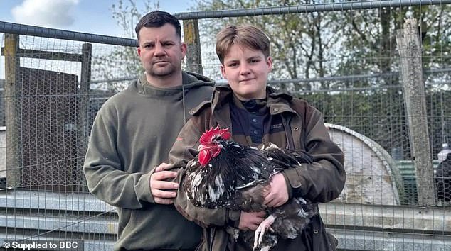 Tom Amos, de 41 años, y su hijo Tom Barker Amos, de 14, y su gallo Brian, que se enfrenta al desalojo de la parcela donde ha pasado los tres años de su vida.