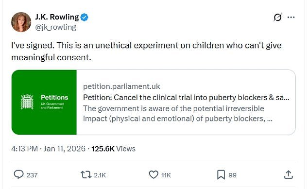 JK Rowling ha respaldado una petición contra un ensayo planificado por el NHS sobre bloqueadores de la pubertad, describiéndolo como “un experimento poco ético con niños que no pueden dar un consentimiento significativo”.