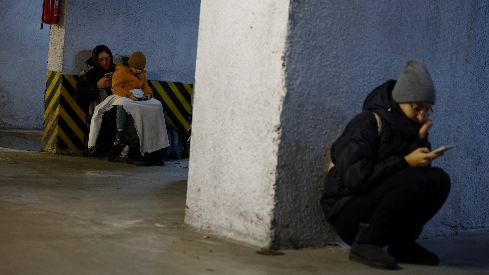 La gente se refugia en un estacionamiento subterráneo durante los ataques con misiles y drones rusos durante el ataque ruso a Ucrania el 25 de noviembre de 2025 en Kiev, Ucrania.