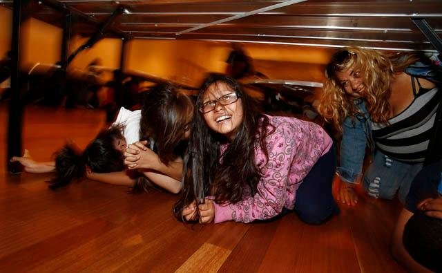 Se les anima a “tirar, esconderse y agarrarse” y se les dan consejos y otra información sobre cómo mantenerse a salvo durante el próximo gran terremoto.