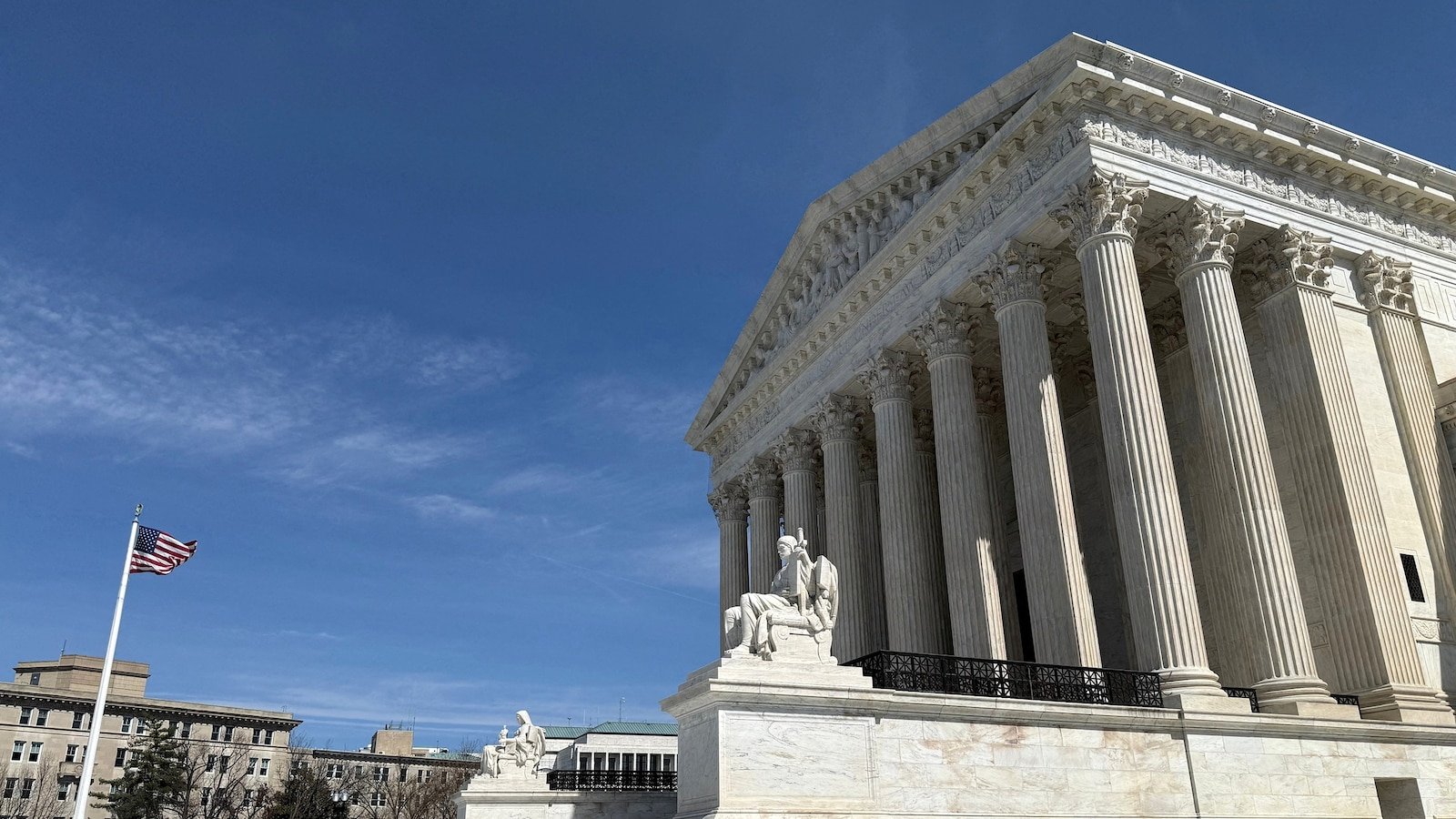 En esta fotografía de archivo del 14 de marzo de 2026, una bandera estadounidense ondea frente al edificio de la Corte Suprema en Washington, DC.