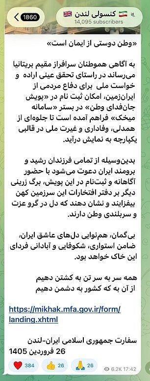 Los funcionarios del consulado publicaron un mensaje pidiendo a los “orgullosos compatriotas iraníes que residen en el Reino Unido” que se registren en el programa “Jan Fada” – o “Sacrifice Lives” –.